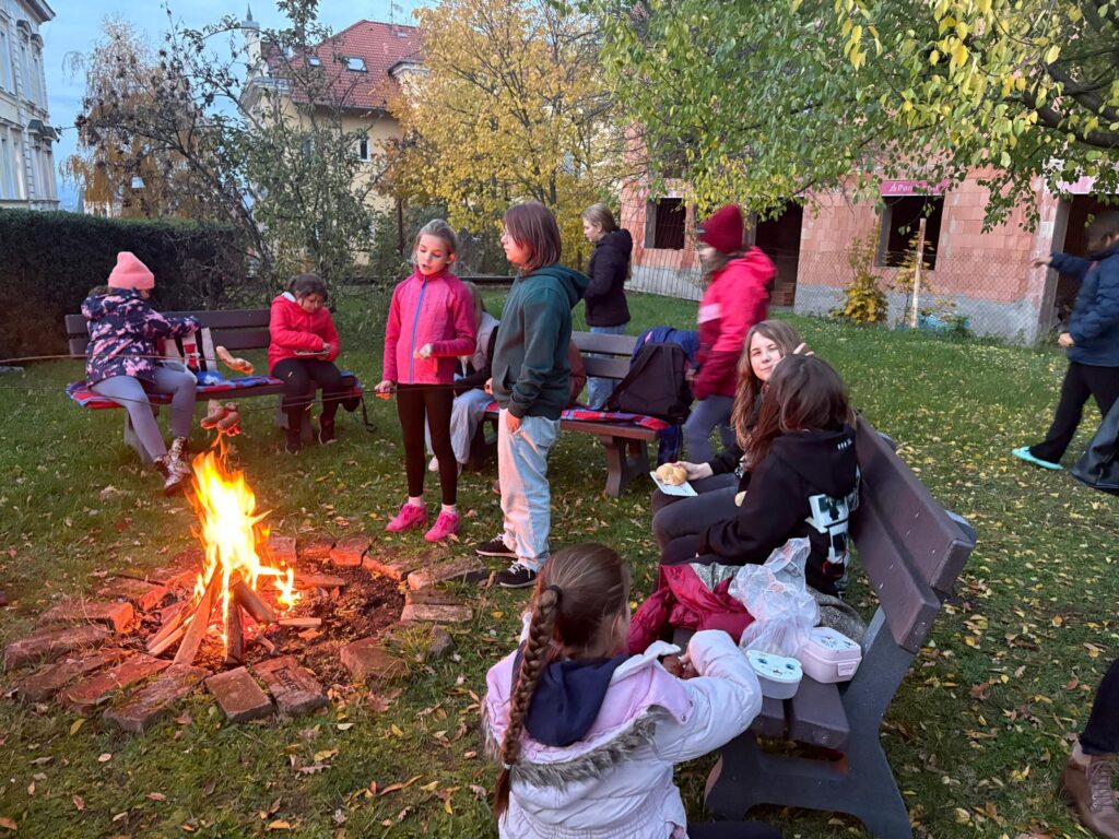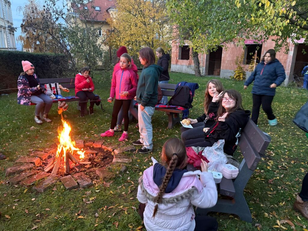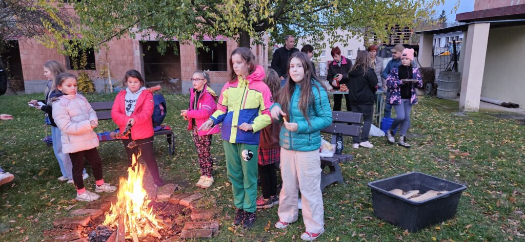 v tělocvičně, opékání buřtů, večerní stezku odvahy vedoucí setmělou školou a